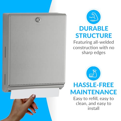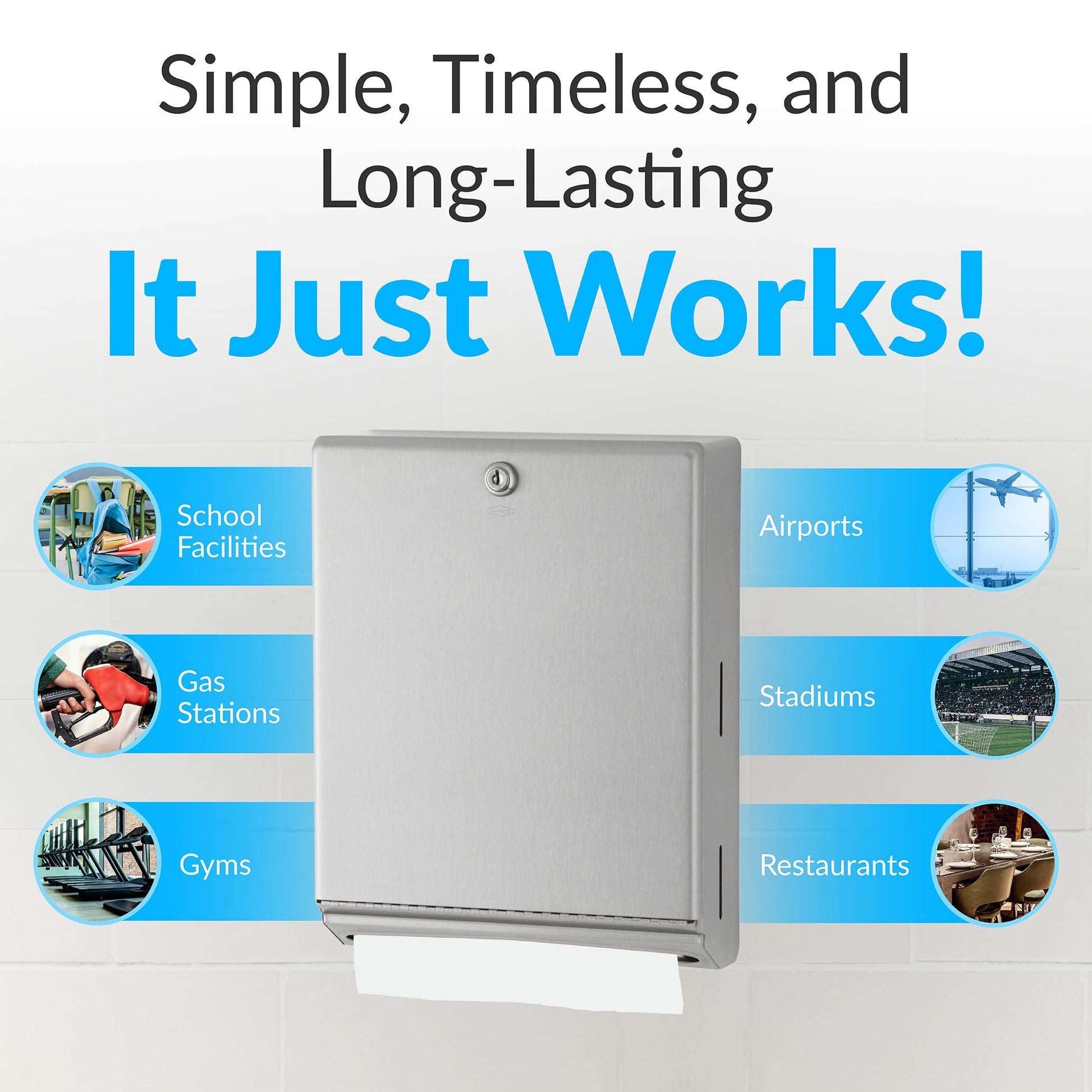 - Durable Structure & Hassle-Free Installation - Our paper towel dispenser is designed with all-welded construction, no sharp edges, and a full-length piano hinge. It's built to last longer with type 304 stainless steel. This commercial bathroom towel dispenser is easy to refill, easy to clean, and easy to install. It just works.